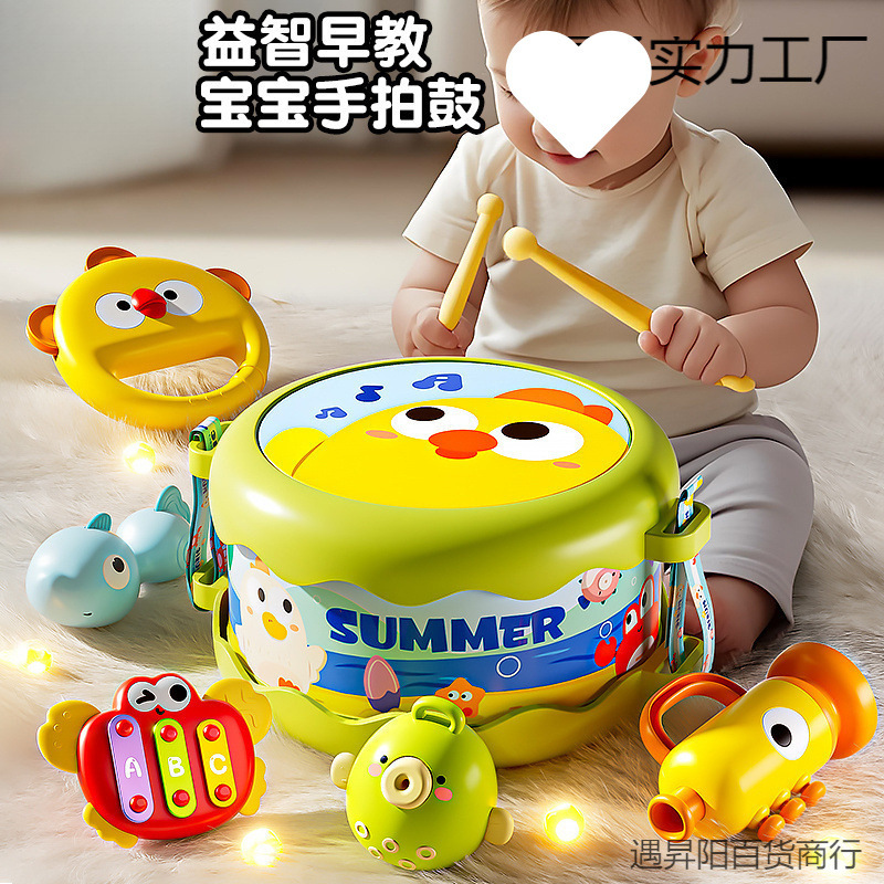 両面で太鼓をたたいて子供の手で太鼓をたたいて打楽器の赤ちゃんが琴をたたいています。