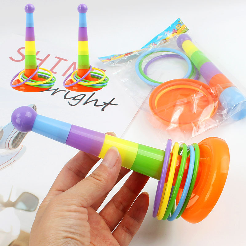 創意的な重ね楽の輪の漫画の小さいサイズの親子は輪の露店を投げて新しい商品を売ります。