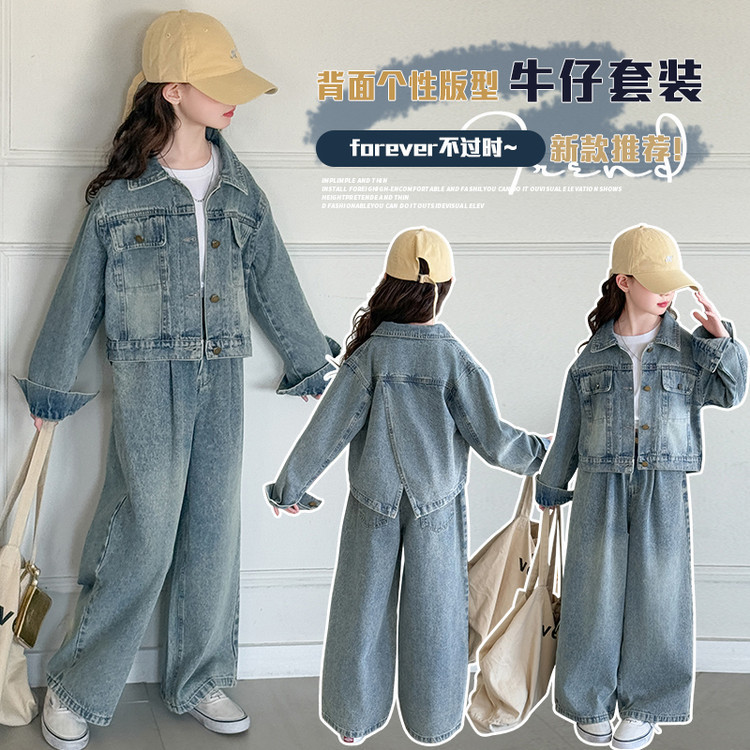 女の子のデニムのスーツの春と秋の2025の新型の女の子の大きい子供の韓系の上着の子供の春の服の広い足のズボンの2つのセット