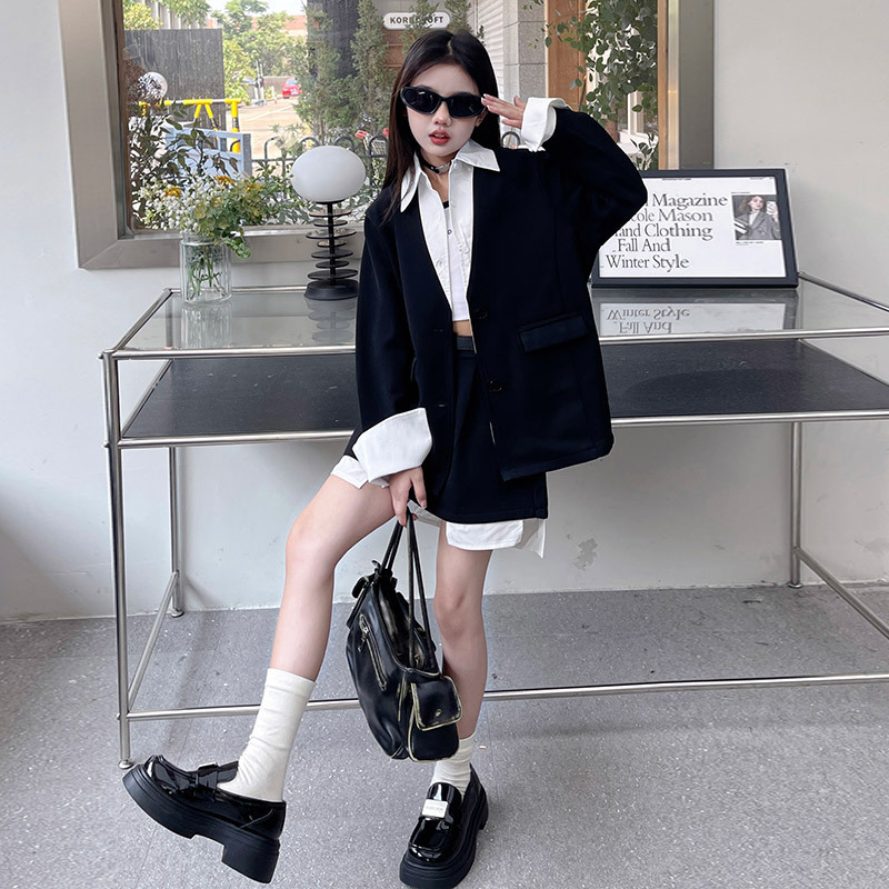 女の子の秋のスーツ2024の新しいファッションの女の子の韓国系の子供の洋風のスーツのシャツの半ズボンの2つのセット