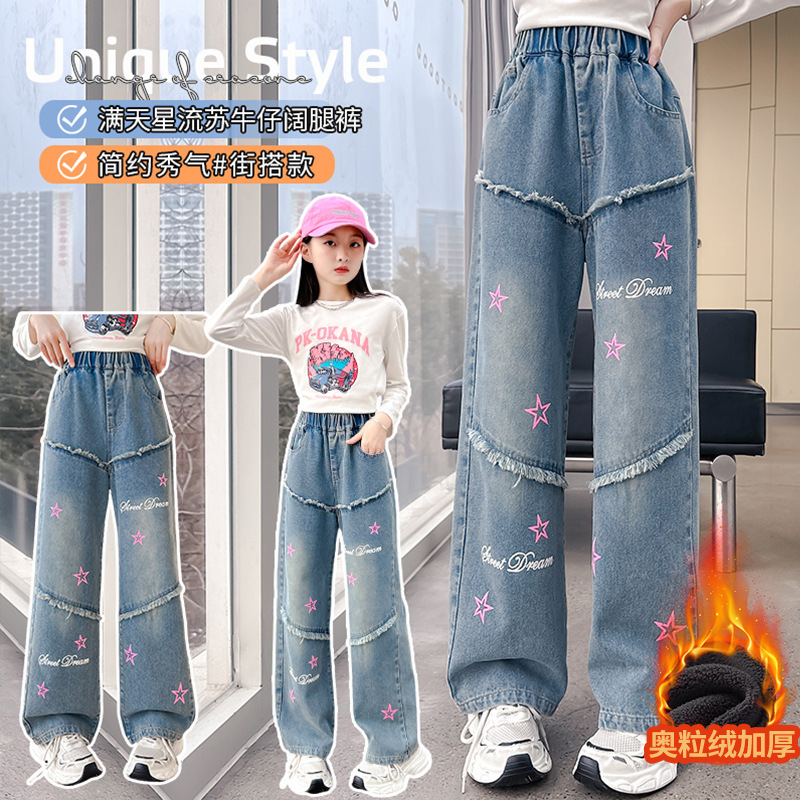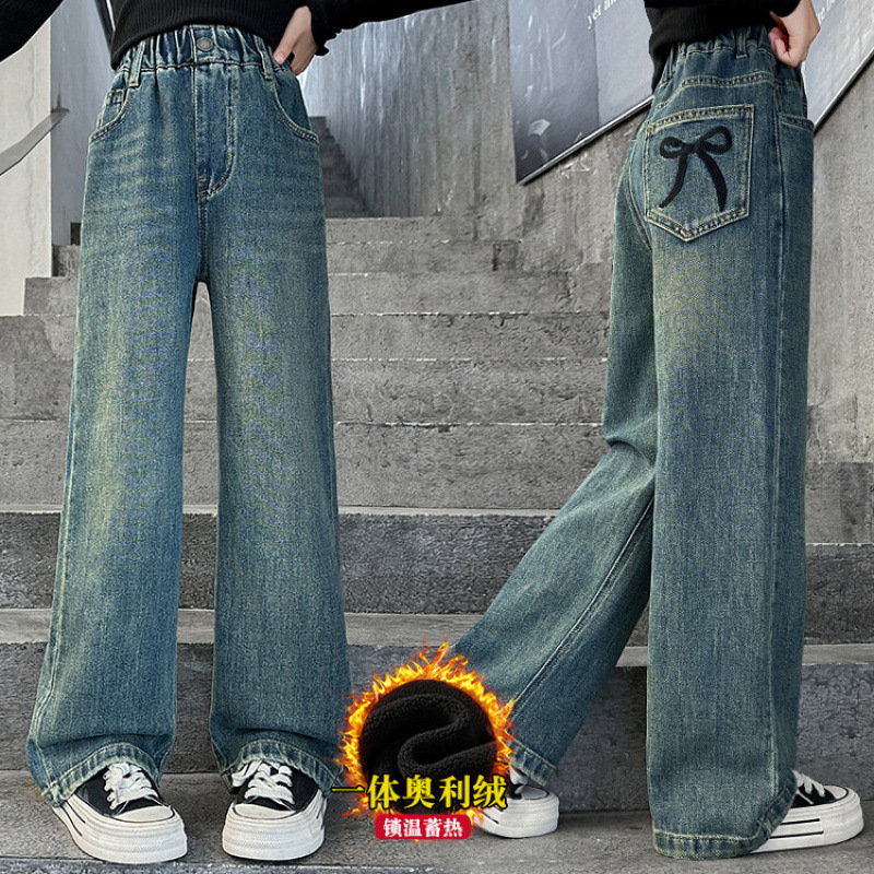 女の子の秋冬服のジーパンの子供服の2024の新型の一体の絨毛の洋気の冬のズボンの大きい子供のストレートなズボンは国境を越えます。