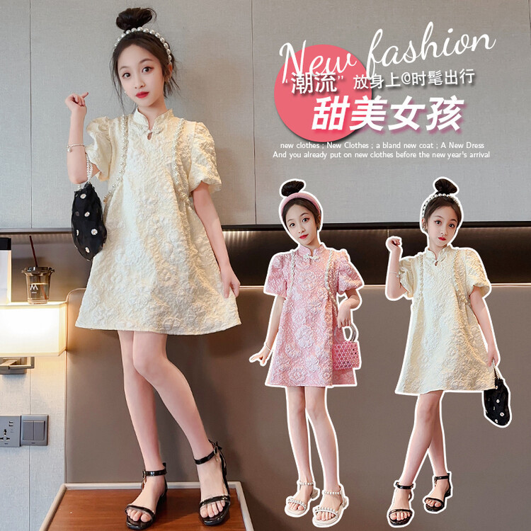 女の子の夏服のワンピース2024新型の女の子の中国風のチャイナドレスの子供の洋風の泡の袖の王女のスカート