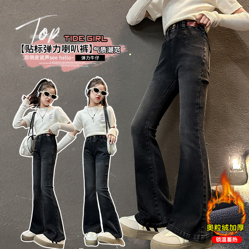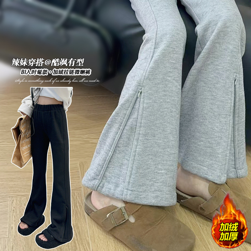 女の子の秋冬のラッパのズボンの2024の新しいファッションの女の子の韓系の中で大きい子供の洋気のベルベットの厚いラッパの衛のズボン