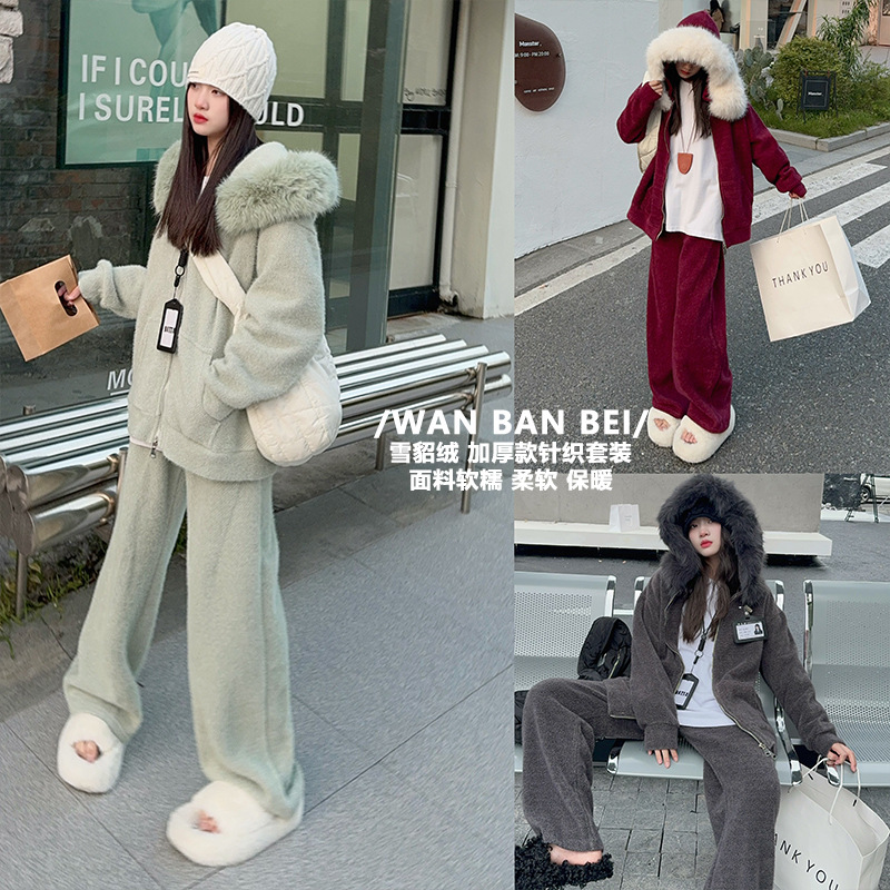 深冬の女の子とファッションカジュアルなミンクのベルベットの襟のセットと帽子のワイドパンツの2つのセット