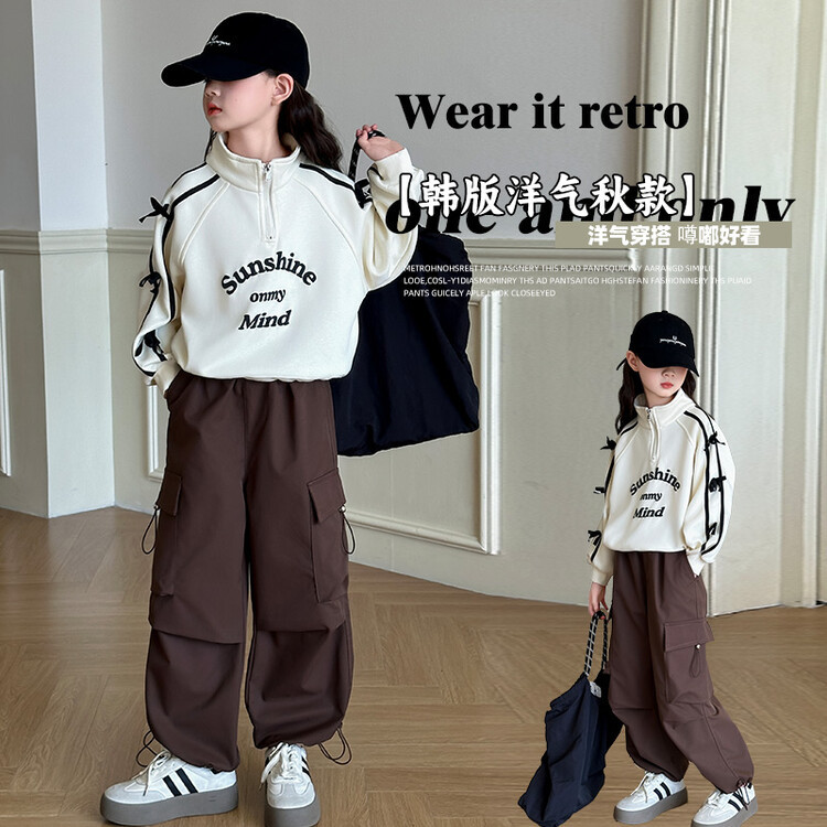 女の子の秋冬の服のスーツの2024の新しい女の子の韓系の中で大きい子供の黄色のプルオーバーの曲がった刀のズボンのスーツ