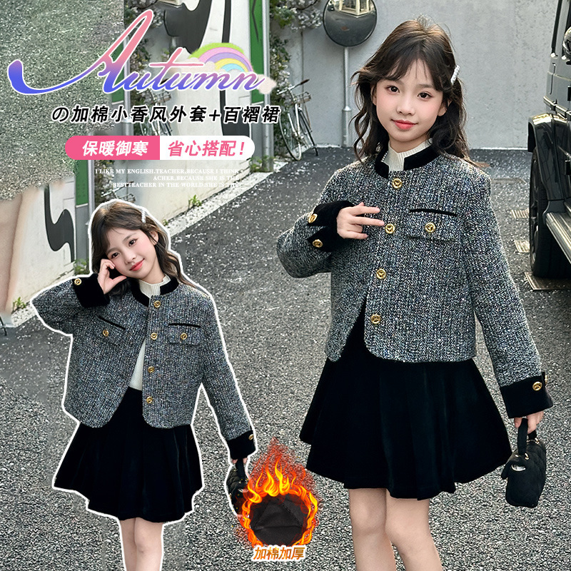 2024冬の新しい女の子はベルベットの小さな香りの風をつなぎ合わせて綿の短いコートを挟んで、洋風のスカートのスーツの子供