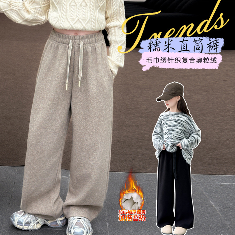 女の子の秋冬のもち米のズボンの2024項のファッションの女の子の韓系の中で大きい子供の洋の空気の一体の絨毯の保温の広い足のズボン