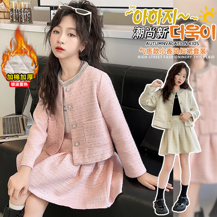 女の子の大きい子供の小さい香風のスーツのスカートの2025新型の春秋服の女の子のおしゃれな洋風のコートのスカートの2つのセット