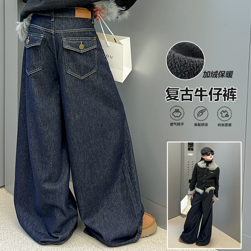 女の子のデニムのラッパのズボンの冬の2024の新型の洋気のファッションの中で大きい子供の広腿のズボンとベルベットの毛の縁の広腿のズボン
