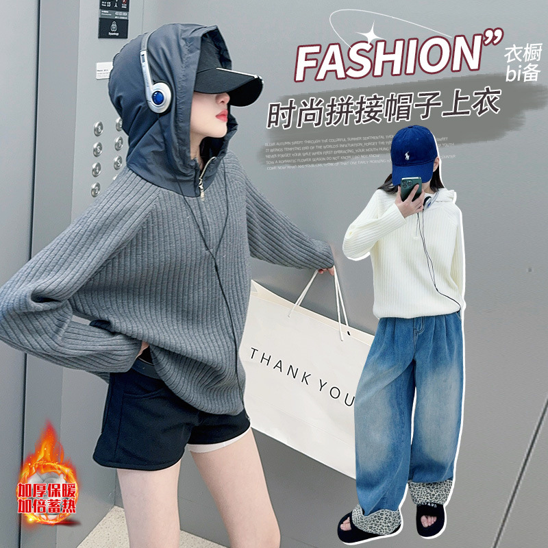 女の子の秋冬セーター2024の新しいファッションの女の子の韓国系の子供の洋気は厚い帽子の上着をつなぎ合わせます。