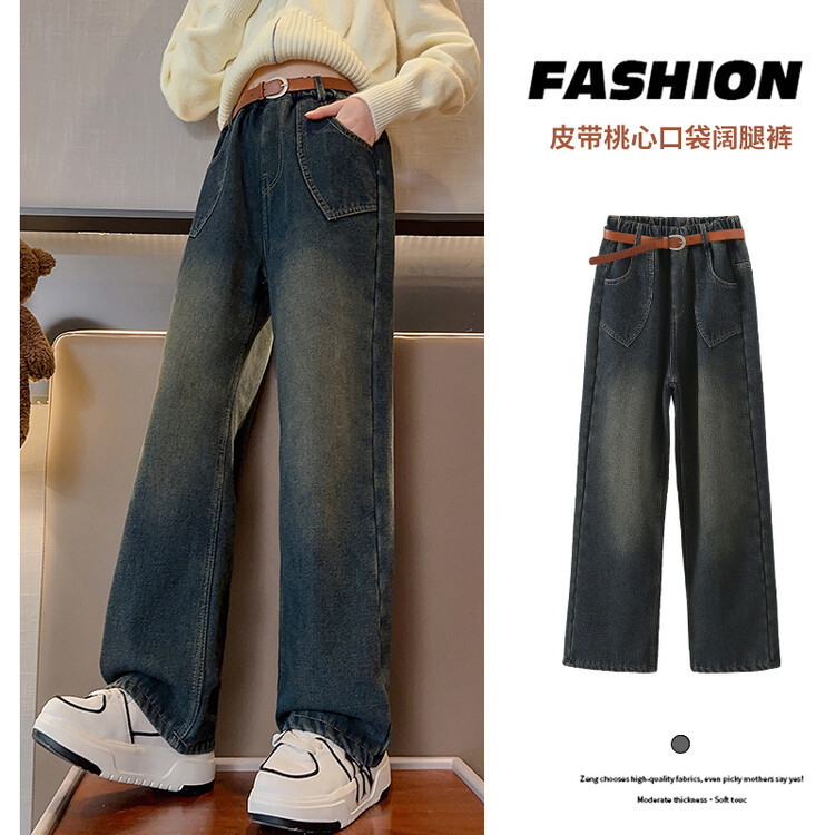 女の子の秋冬ジーンズ2024の新しいファッション女の子の韓国系の子供の洋気とベルベットのストレートパンツが国境を越えている