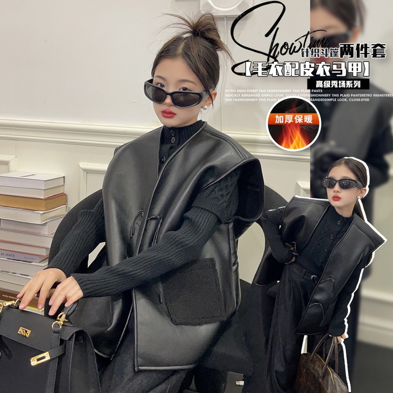 韓国系子供服2024新型ファッション女の子韓国系の子供の洋風とベルベットの厚い皮馬甲の代理