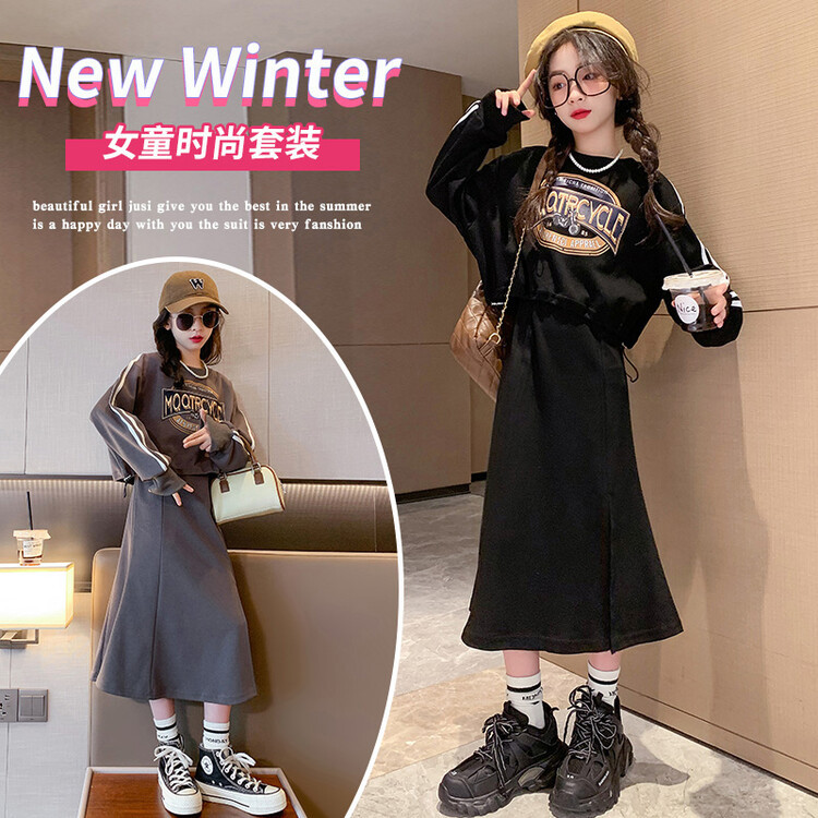 女の子のスーツの春と秋の2つの新型の女の子の大きい子供の洋気の子供服は街の韓国版のスカートのカーディガンの2つのセットを揚げます。