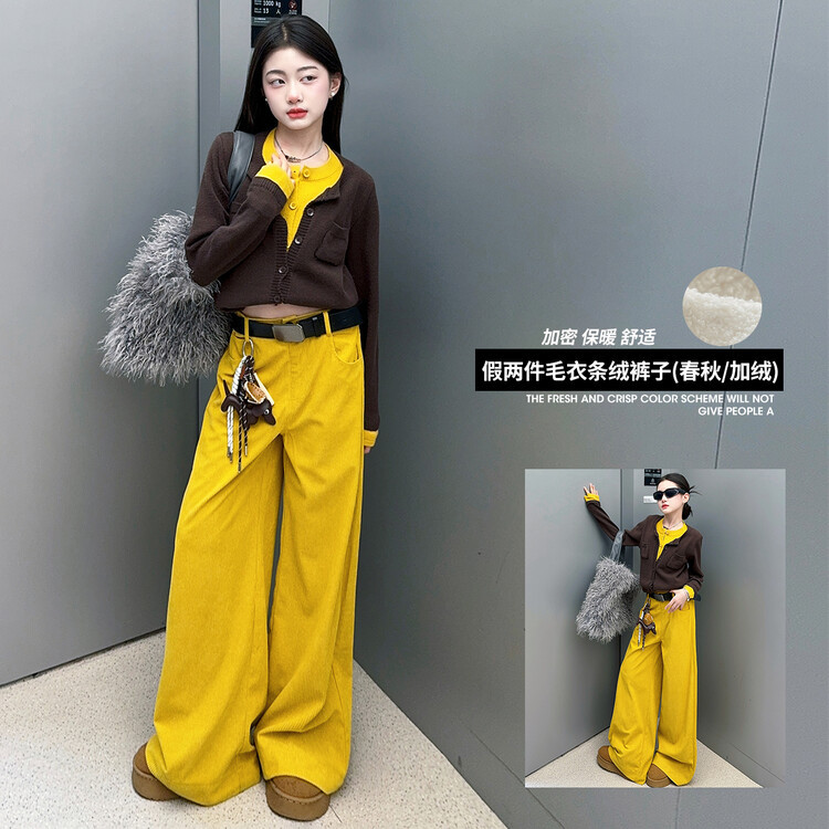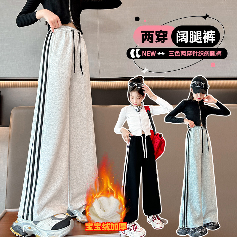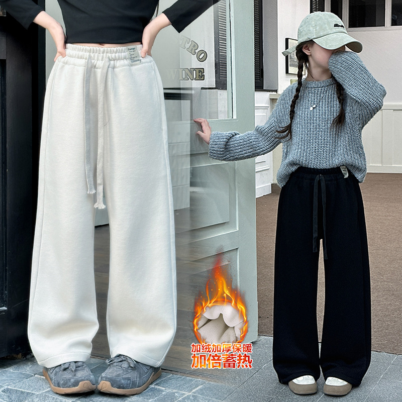 女の子の秋冬のズボンの2024新型のファッションの女の子の韓国系の中で大きい子供の洋気の一体の絨毯の広い足のズボンの潮
