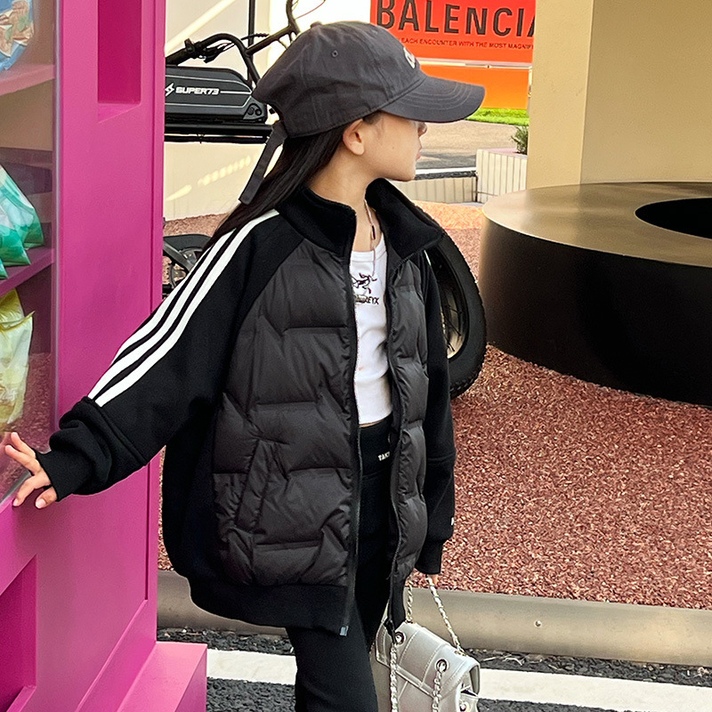 子供のダウンジャケットの女の子の短い金の2024冬の服の中の大きい子供は白いアヒルの毛の中の大胆な制服の神器のコートの潮を洗うことを免除します。