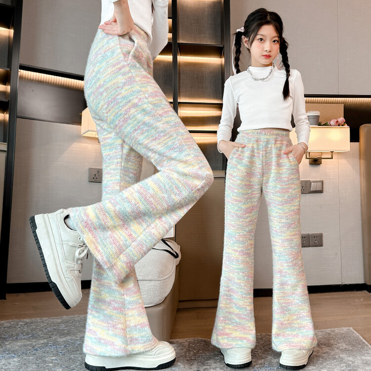 女の子のカジュアルなズボンのラッパのズボンの2024深秋の新型の虹のもち米のラッパのズボンの中で大きい子供の高腰のズボンは国境を越えます。