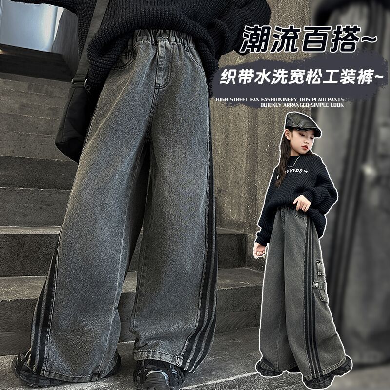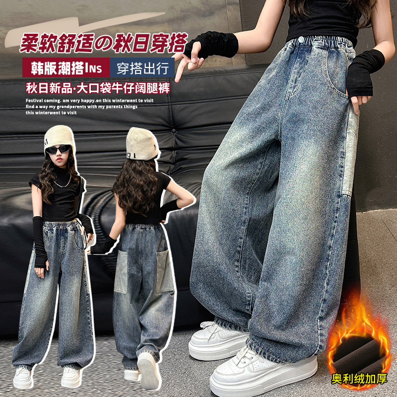 女の子のジーパン2024新型秋冬のゆったりとしたワイドパンツの子供のワイドパンツの潮の大きい子供のバナナのズボンの潮