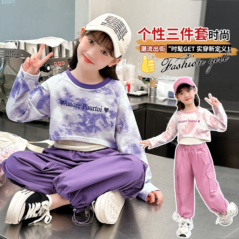 女の子春と秋のスーツ2024新しい女の子子供春の洋風子供のレジャースポーツは、国境を越えた3つのセットに染められています