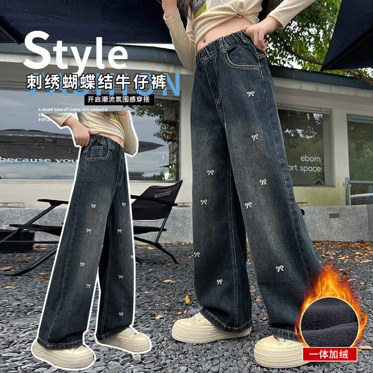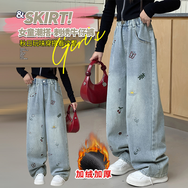 女の子のズボンの秋冬のタイプの2024の新型の女の子の大きい子供の冬のベルベットのまっすぐな筒の広い足のズボンの子供の蝶のジーパン