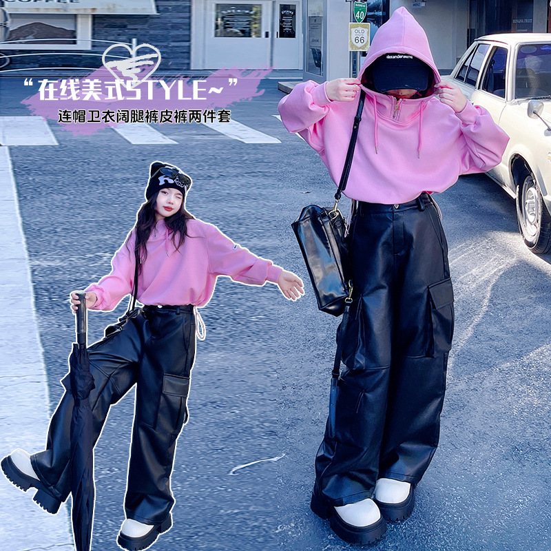 女の子の秋冬のスーツの2024の新しい中で大きい子供の短いタイプの衛衣のアメリカのゆったりしているレジャーの仕事の服装の広い足のPuの皮のズボン