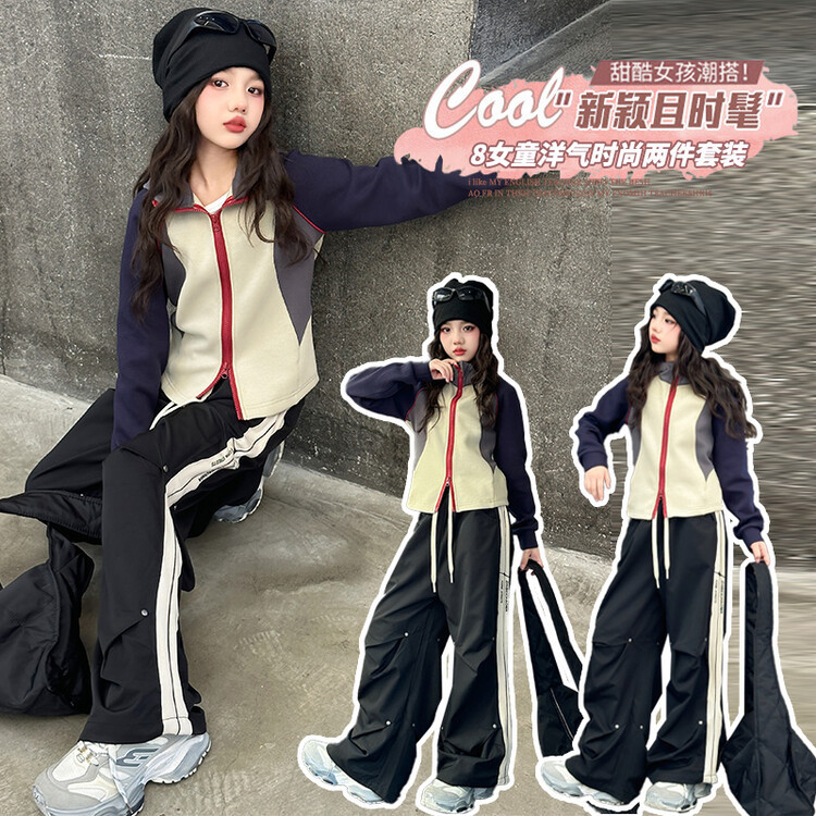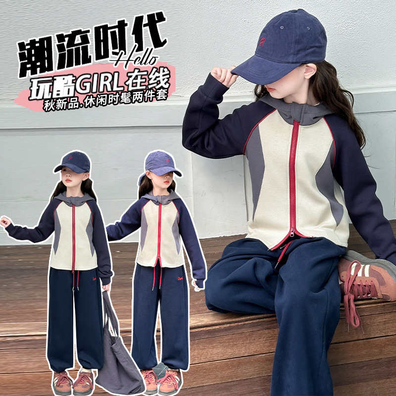 子供の色合わせのスポーツスーツの秋服の女の子の新型の帽子の上着のニットの衛のズボンの2つのセットの越境の潮