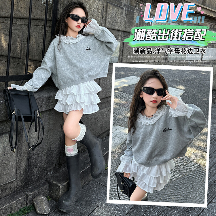 女の子の秋の新しいレースは刺繍の丸首の長袖の衛衣の2024の中で大きい子供のケーキのスカートのスーツの潮をつなぎます。