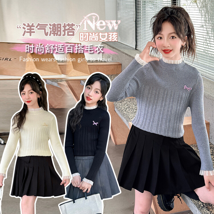 女の子のセーター春秋の金の2024の新型の中で大きい子供の蝶結びの怠惰なプルオーバーのニットの女の子の秋の服装は国境を越えます。