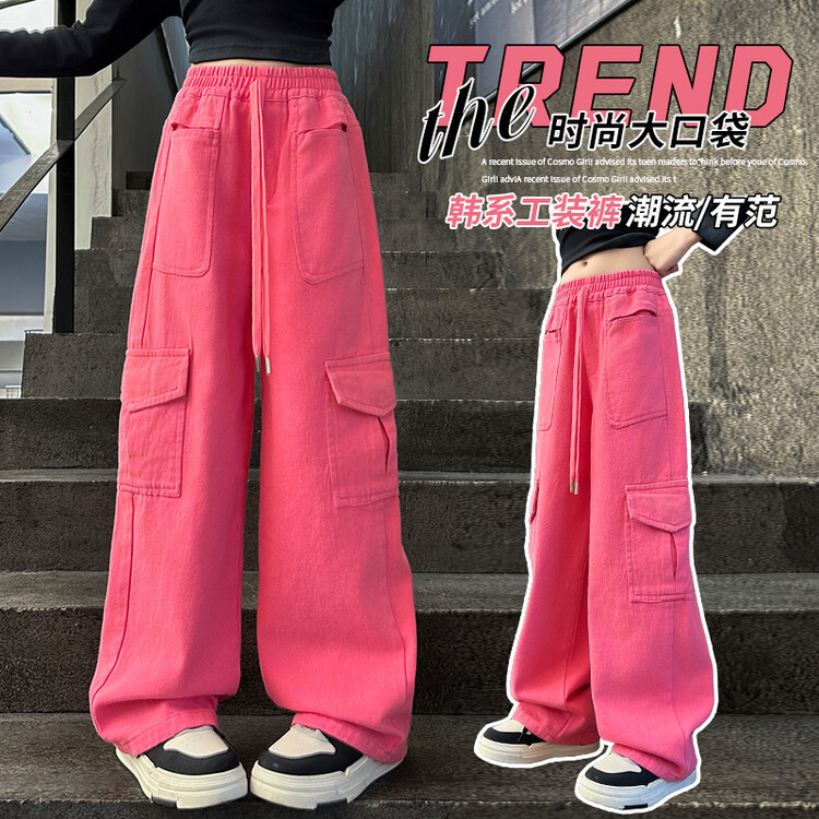 女の子の秋のズボン2024の新しい韓国版の子供のカジュアルなワイドパンツの大きいポケットのズボンのクロスボーダー