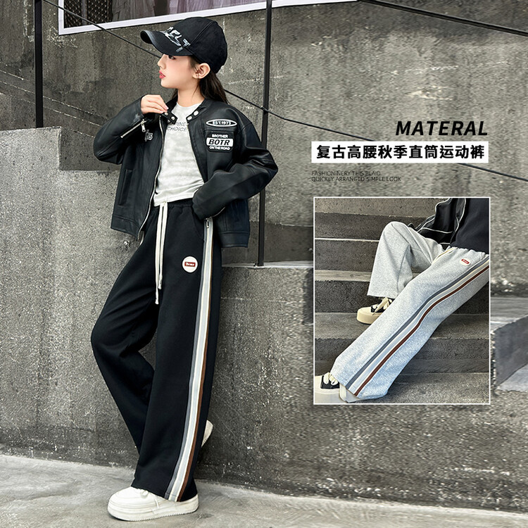 女の子の秋の服の2024の新型の洋気の女性の大きい子供のゆったりしているアルファベットの標準のストレートなズボンの広い足のズボンの運動の長いズボンの潮