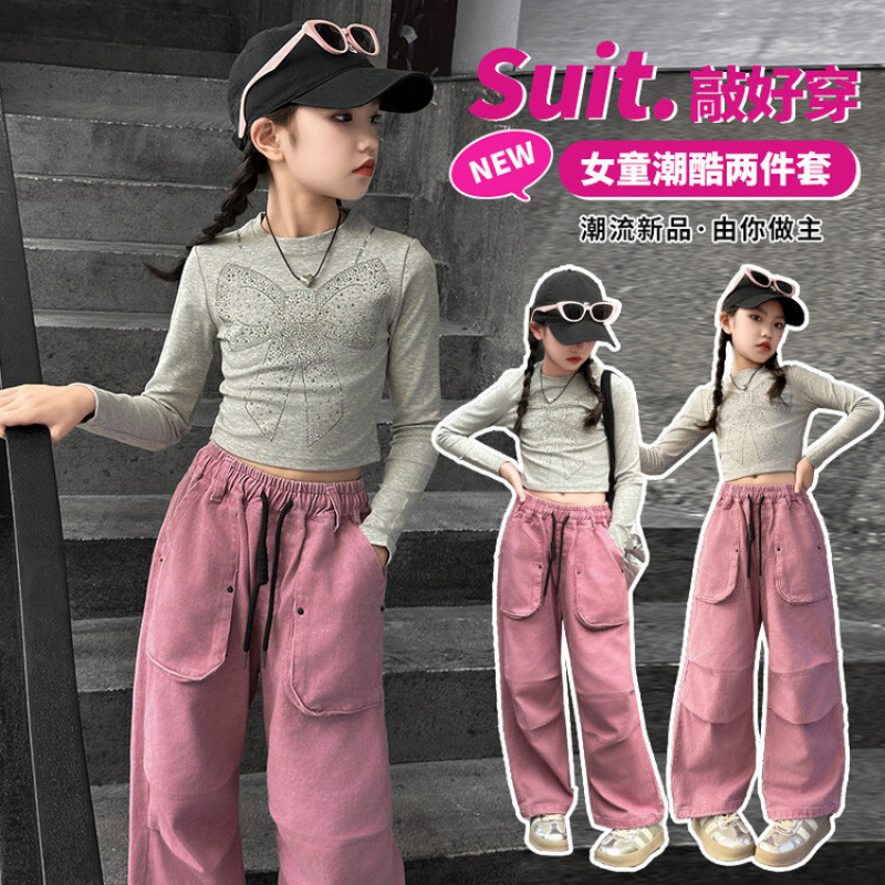 女の子セット2024洋気新型子供韓国版潮酷大童ネット赤ホットシャツ工装ズボン対外貿易