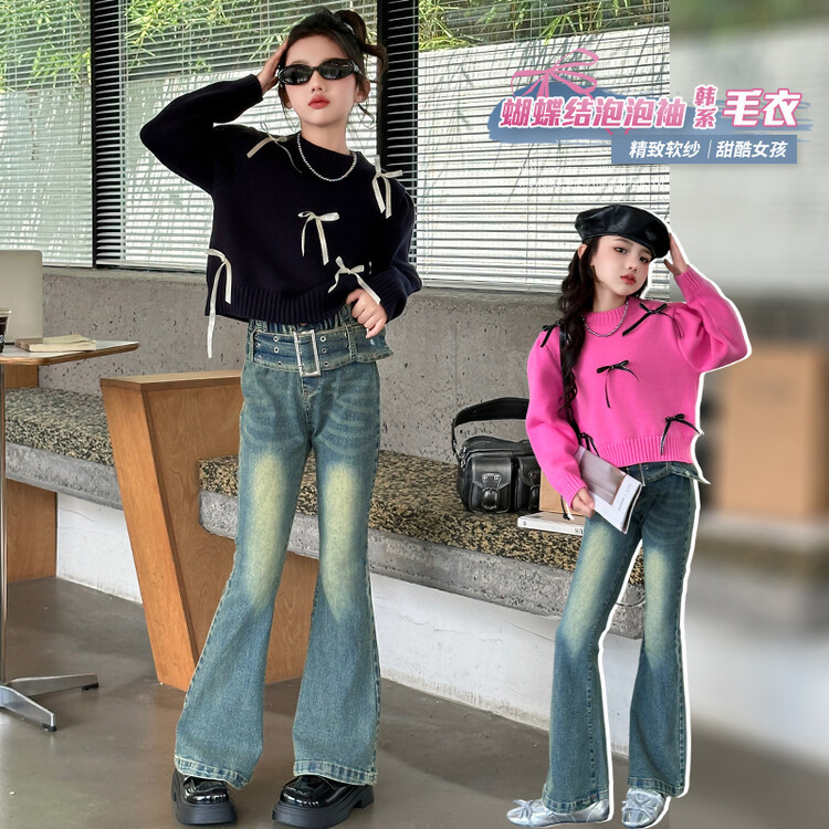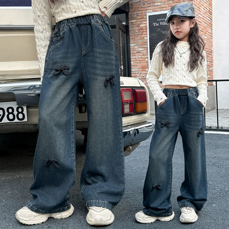 女の子の秋のジーパン2024の新型のファッションの女の子の韓系の中で大きい子供の洋気の蝶結びの広足のズボンのファッション