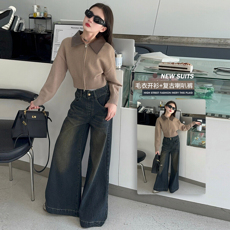 女の子の秋の服装の韓系のスーツの2024の新型のカーディガンのセーターの春秋の中で大きい子供のデニムの広い足のズボンの2つのセットのファッション