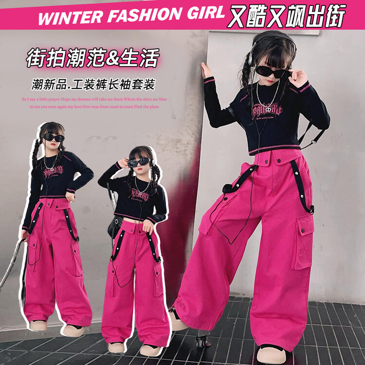 女の子2024秋の新型火龍果工装ズボンセットの中の子供カジュアルなワイドパンツのアルファベットの肩の上着