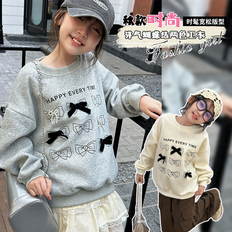 女の子のガーディアンは春と秋の2024の新しい秋の服のプリントの蝶結びの上で服の流行の洋風のゆったりしたプルオーバーを着ます。