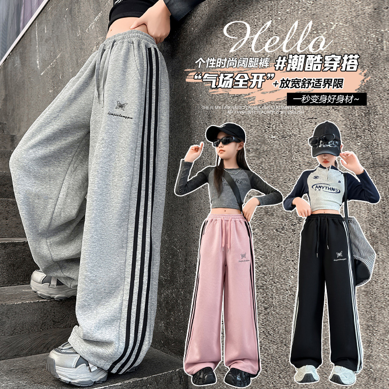 女の子の秋のカジュアルパンツ2024の新しいファッションの女の子の韓系の中で大きい子供の洋気は条の広い足の衛のズボンの潮の子供を引っ張ります。