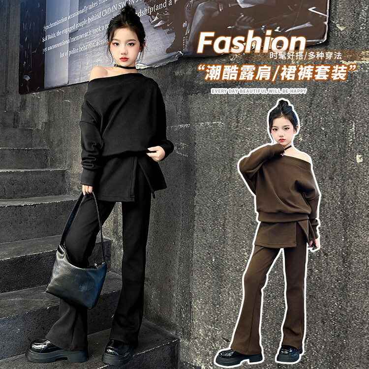 女の子の秋のスーツ2024の新しい韓国版の中で大きい子供の露肩の衛衣は身を修めます。