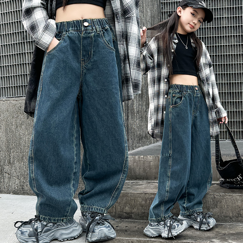 女の子の秋冬タイプのジーンズ2024の新しいファッションの女の子のアメリカの子供のカジュアルなジーンズのワイドパンツのファッション