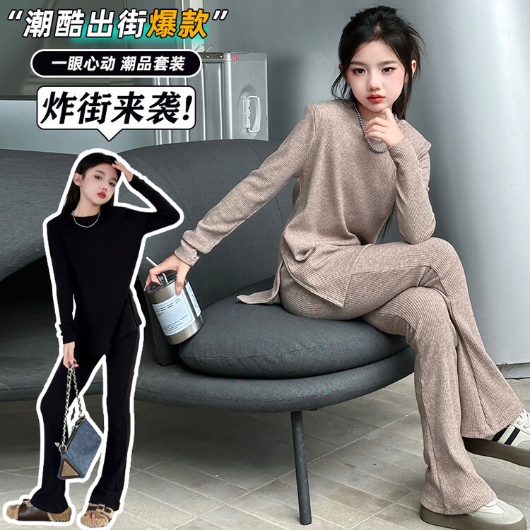 女の子の純色セット2024秋の新型のガードルのズボンの2つのセットの洋気の中の大きい子供の女の子の秋の服は国境を越えます。