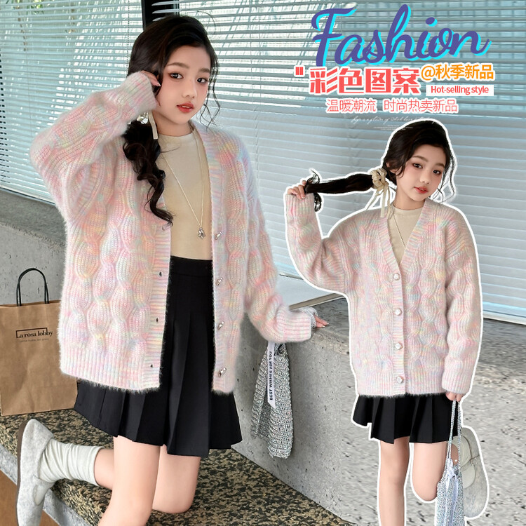 女の子用カーディガンセーター2024新作子供用ニット秋冬女の子カラーストライプ毛糸コートクロスボーダー