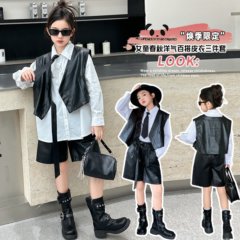 女の子の秋のスーツ2024の新しいファッションの女の子の韓国系の子供の洋気の皮の馬甲の皮の半ズボンの2つのセット