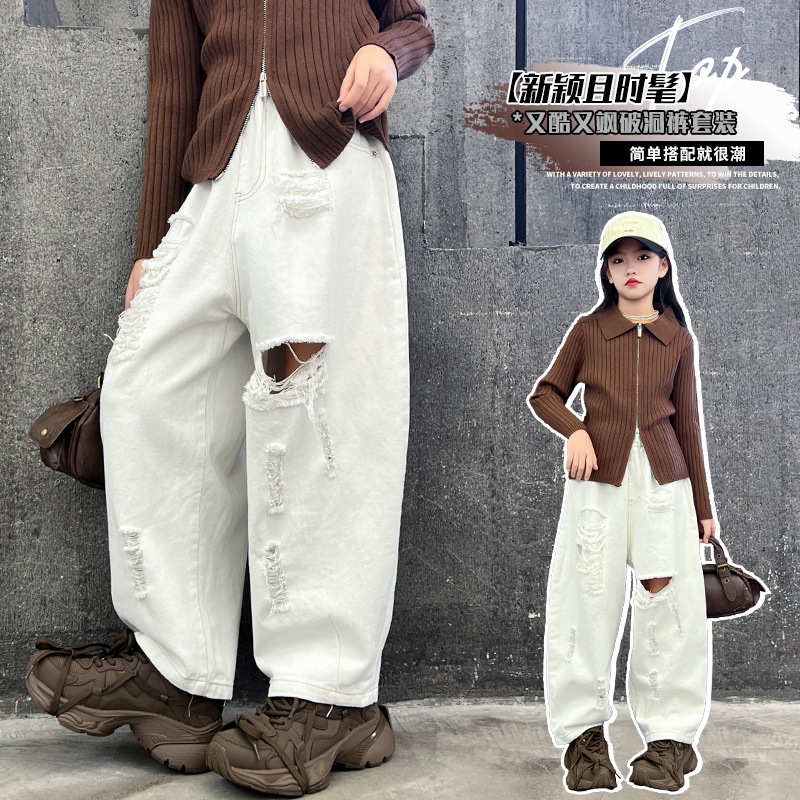 ガールズジーンズの子供の秋の2024の新しい子供の韓国系の穴を割ったストレートパンツ春秋の子供のカジュアルなズボン