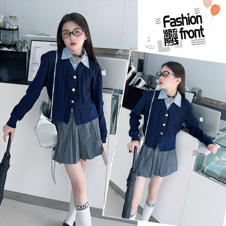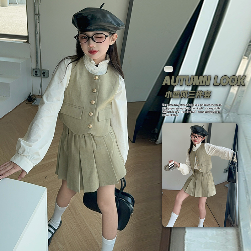 女の子の学院の風のスーツの2024秋のファッションの女の子の中で大きい子供のシャツのスカートのベストのスーツの上着