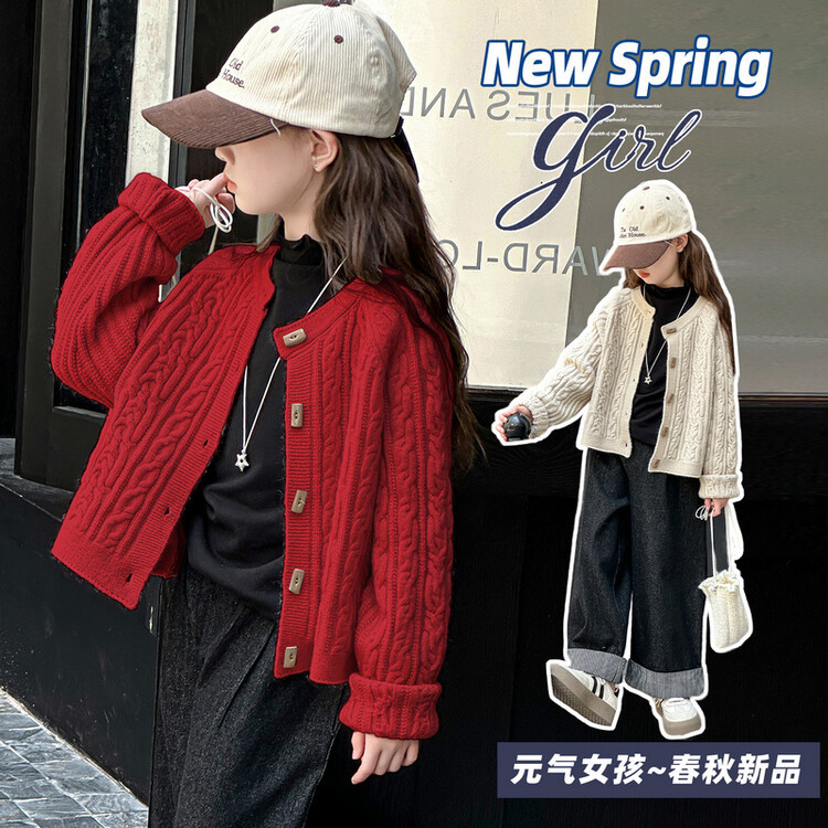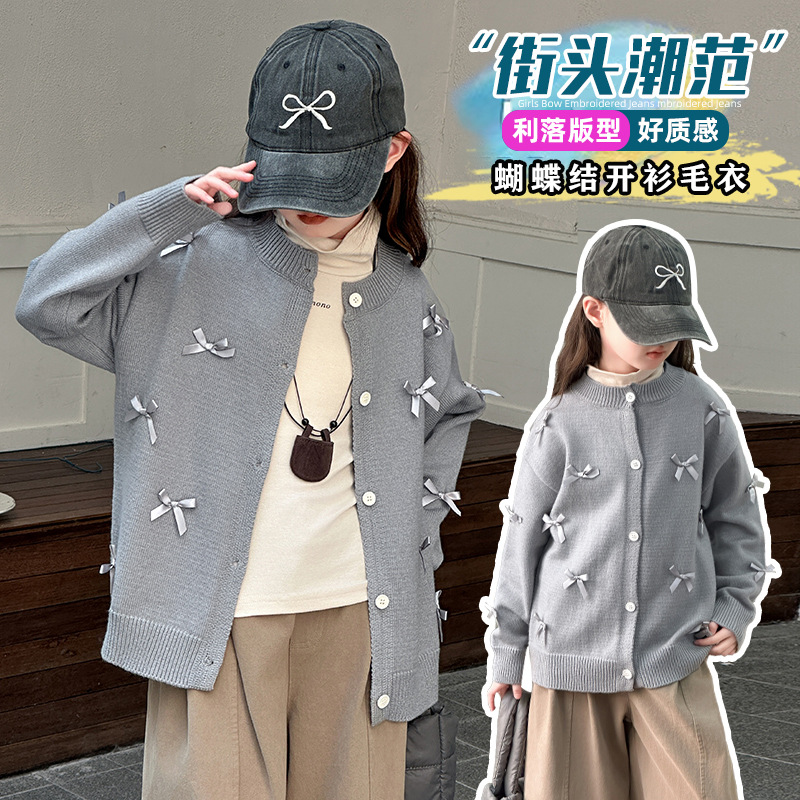 女の子の秋の服のコート2024の新型の洋気の春と秋の子供の早秋のカーディガンのセーターの大きい子供の蝶結びの上着