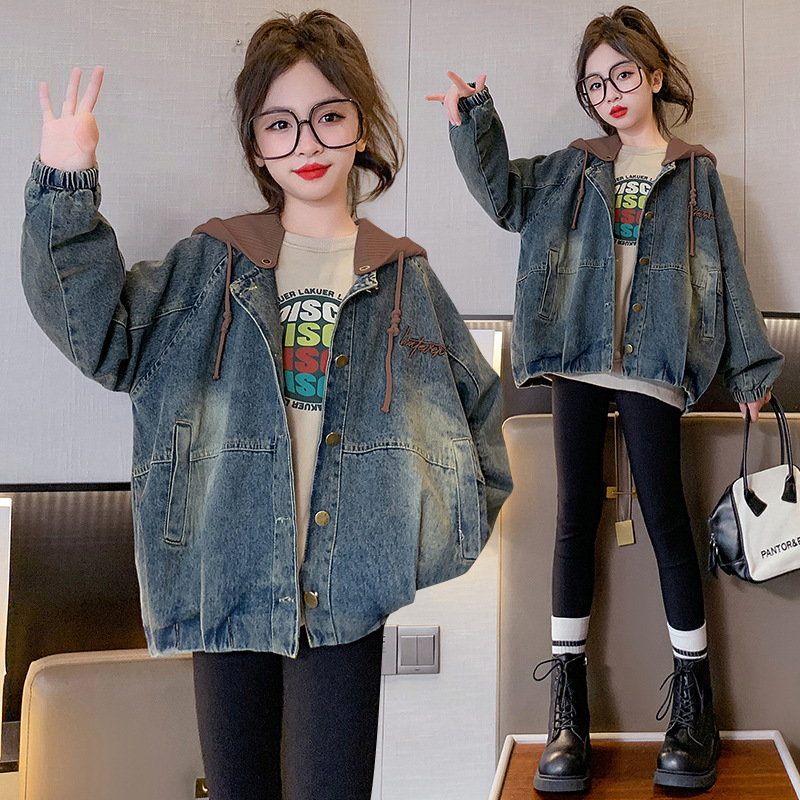 女の子の秋冬のコート2024の新型韓国版の子供のゆったりとしたカジュアルなプリントのデニムのコートと帽子の上着