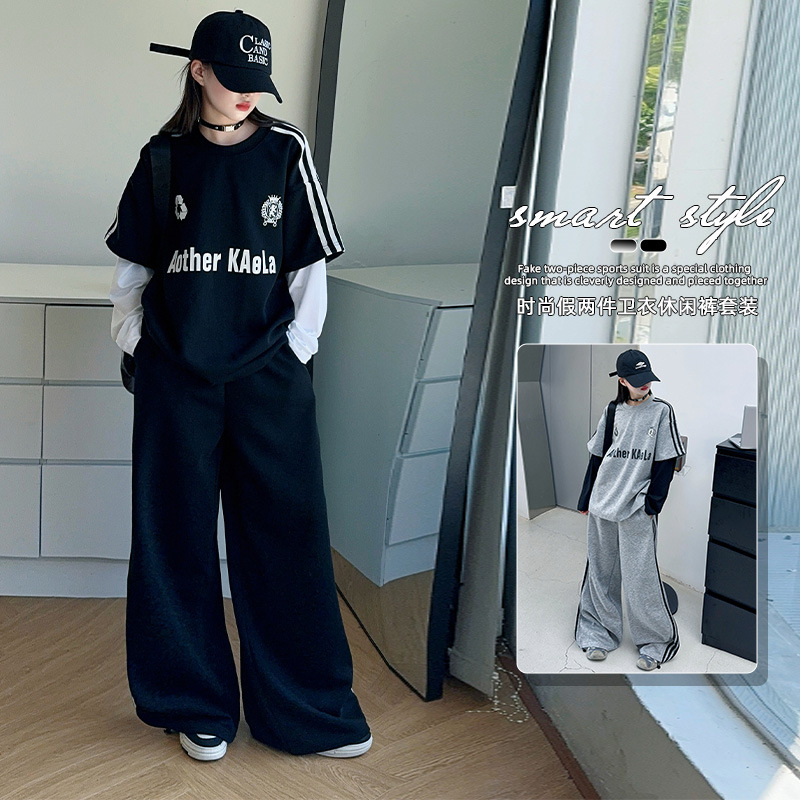 女児の秋の衛衣セット2024新作ファッション女の子の韓国系の中で大きい子供の洋気の偽の2つの衛衣の衛のズボン