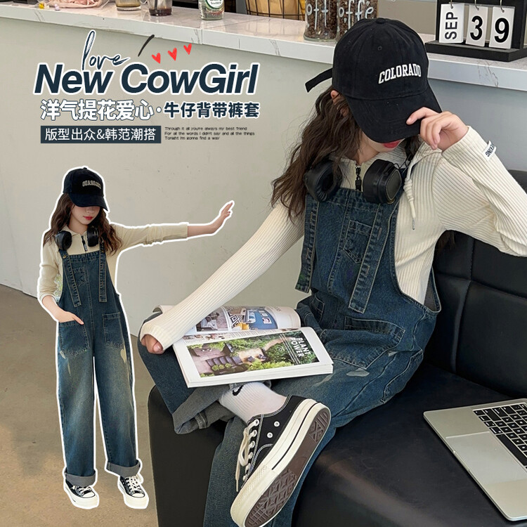 女の子の秋のデニムのスーツの2024ファッションの女の子の中で大きい子供の洋気の港の風のクールな颯爽の工装のデニムの2つのセット