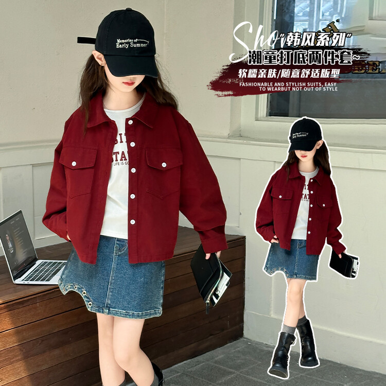 女の子の秋のスーツ2024の新しいファッションの女の子の韓国系の中で大きい子供の洋気のアンゴラの赤いコートの底のシャツ