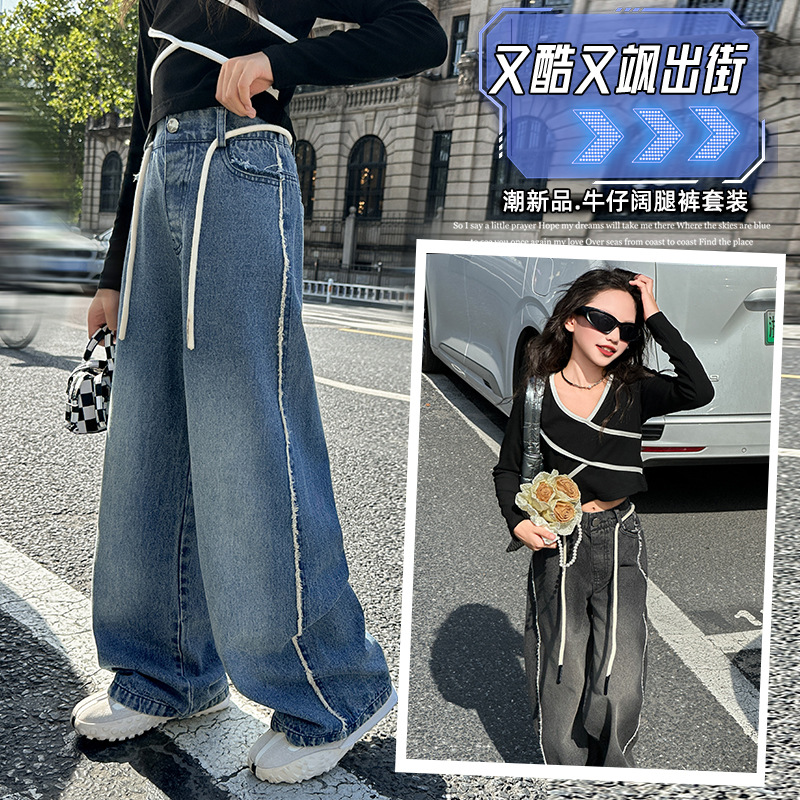 女の子ネット赤不規則長袖tシャツ2024新秋装流行中大童爆街ジーンズ2点セット