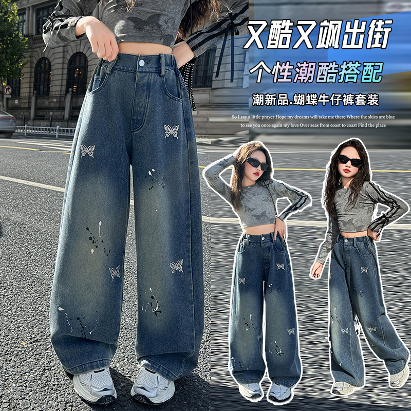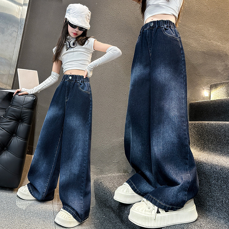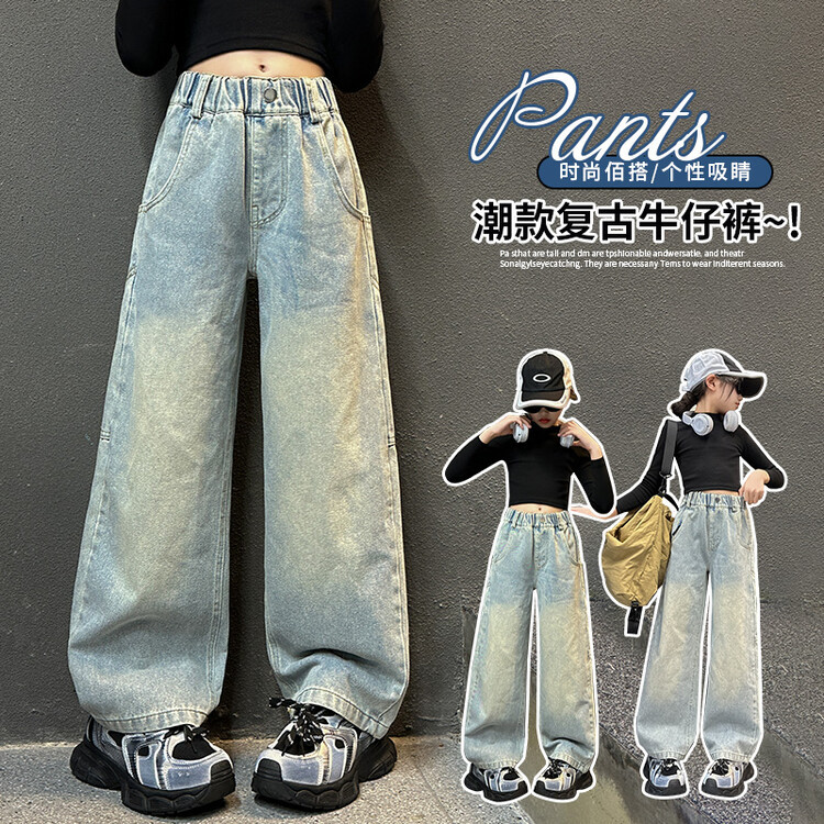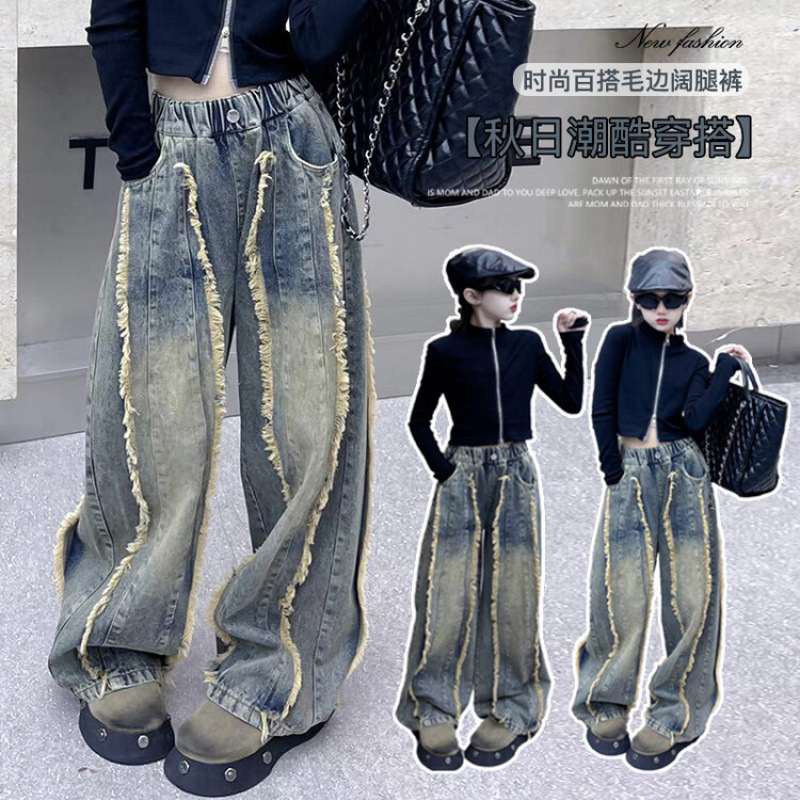 女の子ジーパン2024秋の新型ファッション子供の中で子供の韓国版春秋の濃い色の懐旧色の広い足のズボンのファッション