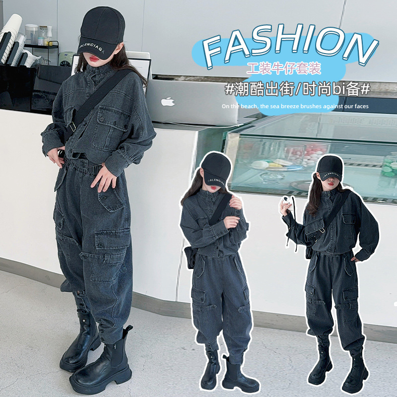 女の子の秋のデニムのスーツの2024の新型のファッションの女の子の韓系の中で大きい子供の洋気はやせているデニムの2つのセットを現します。